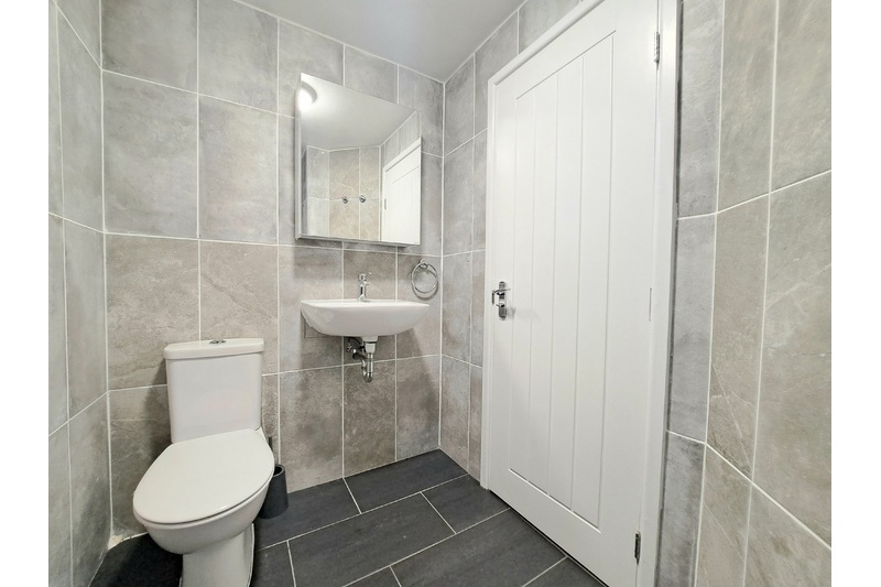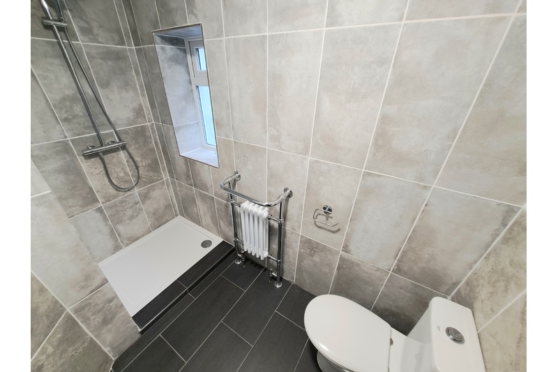 - Shower room (8.32ft x 5.09ft approx): Really modern shower room, stone effect tiled floor to ceiling in a grey tile, dark lino flooring, white bathroom suite.
